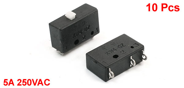 Product Name Micro Switch Model No. KW4-0Z Contact Type SPDT NO NC Actuator Type Push Button Rating 5A 250VAC Total Size(Each) 2 x 1.5 x0.7cm/0.8" x 0.6" x 0.28"(L*W*T) Fixing Holes Diameter 2mm / 0.18" Material Plastic, Metal Switch Color Black Net Weight 23g Package Content 10Pcs x Micro Switch - Reviews