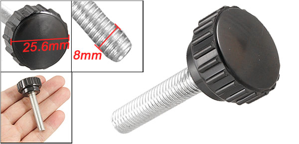DetailsBlack 8mm Diameter 40mm Length Male Thread Knurled Knob  Product Name Knurled Knob Type Screw On Head Diameter(Approx) 25.6mm / 0.101" Thread Pole Length(Approx) 40mm / 1.574" Thread Pole Diameter(Approx) 8mm / 0.315" Overall Height 55.6mm / 2.2" Material Metal & Plastic Color Silver Tone & Black Weight 25g Package Content 1 x Knurled Knob
