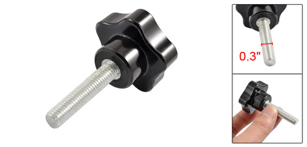 Product Name Star Knob Type Screw Type Head Size 38.5 x 38.5 x 22mm / 1.5" x 1.5" x 0.8" (L*W*T) Thread Length 40mm / 1.5" Thread Diameter 8mm / 0.3" Total Length 65mm / 2.5" Material Metal, Plastic Color Silver Tone, Black Net Weight 40g Package Content 1 x Star Knob - Reviews
