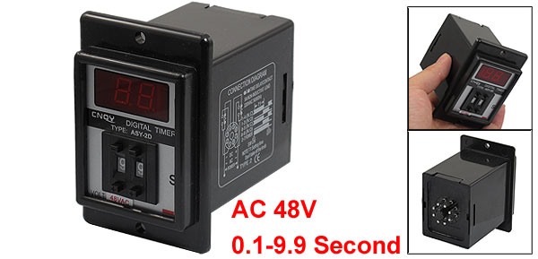DetailsBlack AC 48V Power on Delay Timer Time Relay 0.1-9.9 Second 8 Pins ASY-2D  Product Name Digital Time Relay Type ASY-2D Rated Voltage AC 48V Frequency 50/60 Hz Contact AC 220V 5A Non-inductive Load Time Range 0.1-9.9 Second Mount Size (Approx.) 49 x 68 x 61mm/ 1.9" x 2.7" x 2.4" (L*W*H) Mount Hole Diameter 4mm/ 0.16" Total Size 57 x 90 x 86mm/2.2" x 3.5" x 3.4"(L*W*H) Color Black Net Weight 200g Package Content 1 x Digital Time Relay