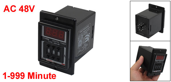 Product Name Digital Time Relay Type ASY-3D Rated Voltage AC 48V Frequency 50/60 Hz Contact AC 220V 5A Non-inductive Load Time Range 1-999 Minute Mount Size (Approx.) 49 x 68 x 61mm/ 1.9" x 2.7" x 2.4" (L*W*H) Mount Hole Diameter 4mm/ 0.16" Total Size 57 x 90 x 86mm/2.2" x 3.5" x 3.4"(L*W*H) Color Black Net Weight 205g Package Content 1 x Digital Time Relay - Reviews
