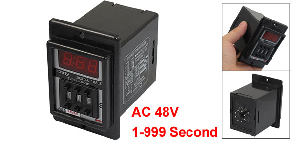 DetailsBlack AC 48V Power on Delay Timer Time Relay 1-999 Second 8 Pins ASY-3D  Product Name Digital Time Relay Type ASY-3D Rated Voltage AC 48V Frequency 50/60 Hz Contact AC 220V 5A Non-inductive Load Time Range 1-999 Second Mount Size (Approx.) 49 x 68 x 61mm/ 1.9" x 2.7" x 2.4" (L*W*H) Mount Hole Diameter 4mm/ 0.16" Total Size 57 x 90 x 86mm/2.2" x 3.5" x 3.4"(L*W*H) Color Black Net Weight 204g Package Content 1 x Digital Time Relay