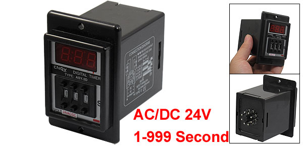Product Name Digital Time Relay Type ASY-3D Rated Voltage AC/DC 24V Frequency 50/60 Hz Contact AC 220V 5A Non-inductive Load Time Range 1-999 Second Mount Size (Approx.) 49 x 68 x 61mm/ 1.9" x 2.7" x 2.4" (L*W*H) Mount Hole Diameter 4mm/ 0.16" Total Size 57 x 90 x 86mm/2.2" x 3.5" x 3.4"(L*W*H) Color Black Net Weight 134g Package Content 1 x Digital Time Relay - Reviews