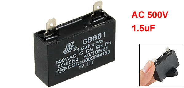 DetailsBlack CBB61 AC 500V 1.5uF Plastic Shell Motor Run Capacitor  Product Name Motor Run Capacitor Model CBB61 Material Polypropylene, Metal Rated Capacitance 1.5uF Tolerance +/-5% Rated Frequency 50/60 Hz Rated Voltage 500V AC Mounting Hole Diameter 5mm / 0.2" Body Size (Approx) 3.6 x 2.2 x 1.1cm/ 1.4" x 0.9" x 0.4"(L*W*H) Main Color Black Weight 13g Package Content 1 x Motor Run Capacitor