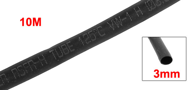 Black Heat Shrinkable Tubing Shrink Tube 3mm Diameter 10M 33ft 125C