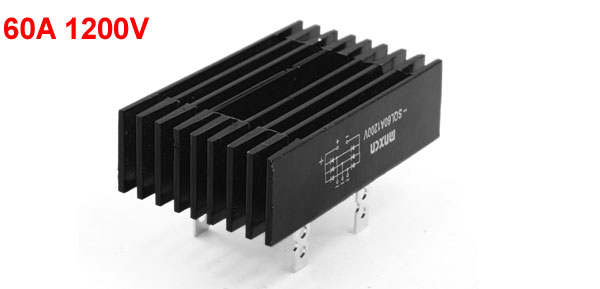 Product Name Bridge Rectifier Model -SQL60A/1200V Output Current(DC) 60A Repetitive Peak Reverse Voltage(AC) 1200V Fixing Holes Diameter 5mm / 0.19" Fixing Holes Spacing 52mm / 2" Main Body Size 98 x 59 x 29mm / 3.86" x 2.3" x 1.1" (L*W*T) Overall Height 56mm / 2.2" Material Metal Color Black Net Weight 240g Package Content 1 x Bridge Rectifier - Reviews