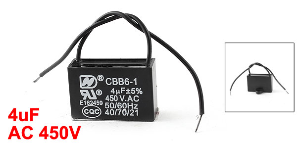 Product Name Motor Capacitor Model CBB6-1 Color Black External Material Plastic Dielectric Material Metalized Polypropylene Film Rated Capacitance 4uF Tolerance ±5% Rated Frequency 50/60Hz Rated Voltage AC 450V Body Size 45 x 30 x 27mm/ 0.8" x 1.2" x 1.1"(L*W*T) Fixing Hole Diameter 5mm/0.2" Cable Length 11cm/ 4.3" Net Weight 31g Package Content 1 x Motor Run Capacitor - Reviews