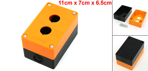 Product Name Control Box Material Plastic Color Black, Orange Location Switch Number 2 Box Total Size 11 x 7 x 6.5cm / 4.3" x 2.7" x 2.5"(L*W*T) Fit for Round Switch Head Diameter 22mm/ 0.87" Net Weight 125g Package Content 1 x Control Box
