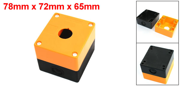 Product Name Push Button Switch Box External Material Plastic Color Orange, Black Hole Diameter 22mm/ 0.87" Overall Size 78 x 72 x 65mm/ 3.1" x 2.8" x 2.6" (L*W*T) Weight 116g Package Content 1 x Push Button Switch Box