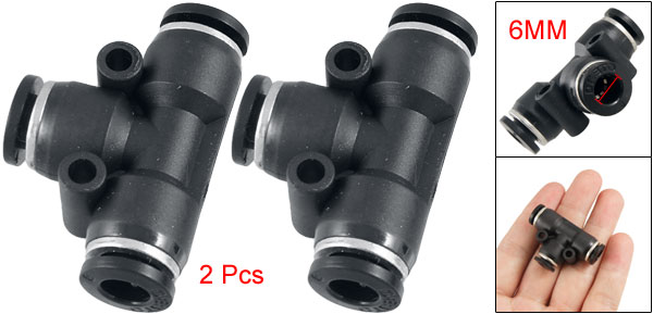Product Name Pneumatic Quick Fittings Connector Type 6mm to 6mm ( T-shaped) Material Plastic Dimension (Approx) 4.3 x 2.9 x 1.5cm/ 1.7" x 1.1" x 0.6" (L*W*T) Main Color Black Weight 18g Package Content 2 x Pneumatic Quick Fittings - Reviews