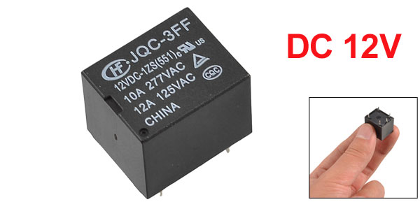 Product Name Relay Material Plastic, Metal Color Black Model JQC-3FF 12VDC-1ZS Number of Pins 5 Coil Voltage DC 12V Rated Load 10A 277VAC / 12A 125VAC Size (Approx.) 1.8x 1.5 x 1.5cm/0.71" x 0.59" x 0.59" (L*W*T)