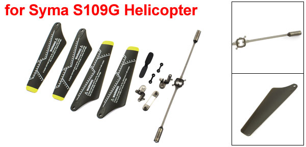 Product Name Main Blade+ Balance Bar+Tail Blade+Blade Clamp Fit for for Syma S109G Helicopter Type A+B Main Blade Shaft Hole Dia 2.5mm / 0.1" Main Blade Rotating Diameter 85mm /3.3" Main Blade Width(Max.) 22mm/0.87" Main Blade Thickness(Max.) 1.5mm / 0.06" Balance Size 130 x 2mm/5.1" x 0.08"(L*D) Tail Blade Rotating Diameter 31mm/1.2" Tail Blade Shaft Hole Dia 0.5mm/0.02" Material Plastic Color Black Net Weight 8g Package Content 1 Set x RC Helicopter Blade(Non-OEM)