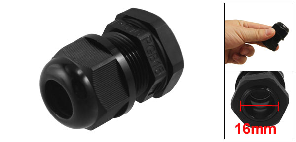 Product Name Cable Gland Model PG16 Cable Range 10-14mm / 0.39"- 0.55" Thread O.D. 16mm / 063“ Thread Length 6.5mm / 0.26” Total Size 20 x 45mm / 0.79" x 1.8" (D*H) Material Plastic Color Black Weight 18g Package Content 1 x Cable Gland - Reviews