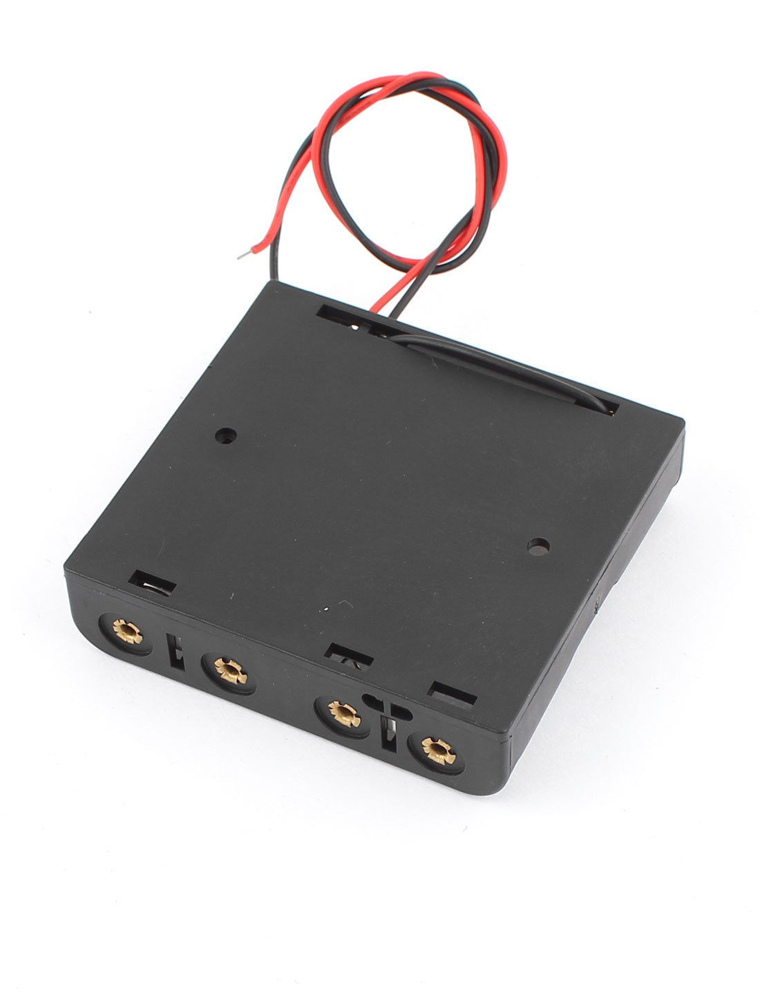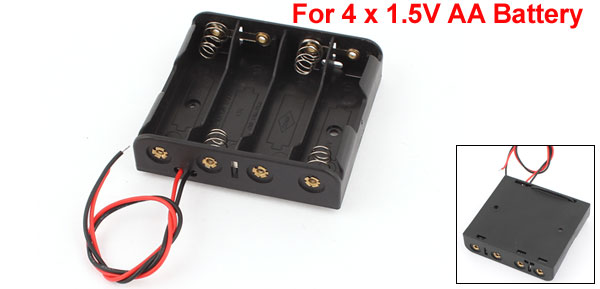 DetailsBlack Plastic Wires Lead Holder Storage Case for 4 x 1.5V AA Battery  Main Color Black ,Red Brand DMiotech Net Weight 16g Country of Manufacture CHINA Cable Length 15cm/6" Package Content 1 x Battery Case Case Size 6 x 6 x 1.5cm/2.4" x 2.4" x 0.6"(L*W*H) Material Plastic, Electric Part Battery Type 4 x 1.5V AAA Battery (Battery not included )