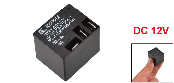 Product Name Relay Material Plastic, Metal Color Black Model RT91-DC12VK Number of Pins 3 Coil Voltage DC 12V Rated Load NO:30A 250VAC / 30A 30VDC