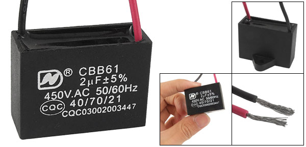 Terminal Wire Ambient Temperature 40/70/21 Rated Capacitance 2uF Tolerance +/-5% Rated Frequency 50/60Hz Rated Voltage 450V AC Size 3.8 x 2.8 x 1.4cm/1.5" x 1.1" x 0.55“(L*W*T) Wire Length 8cm/ 3.2" Install Bore Diameter 0.5cm/ 0.2‘ Main Color Black Weight 21g Package Content 1 x Motor Run Capacitor - Reviews