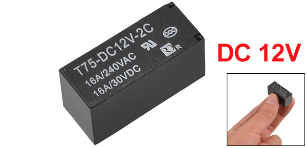 Product Name Relay Material Plastic, Metal Color Black Model T75-DC12V-2C Number of Pins 8 Coil Voltage DC 12V Rated Load 16A 240VAC / 16A 30VDC Size (Approx.) 3x 1.2 x 1.5cm/1.18" x 0.47" x 0.59" (L*W*T)