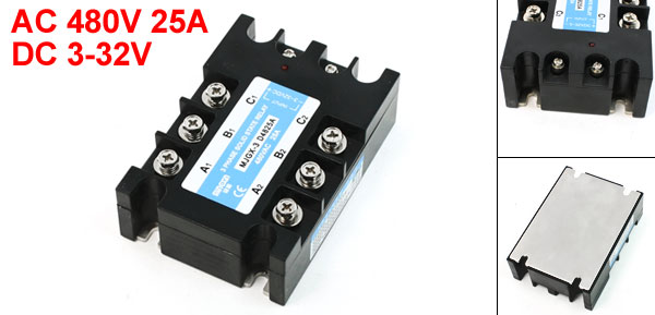 Product Name Three Phase Solid State Relay Model No. MJGX-3 D4825A Control Method DC to AC Input Voltage 3-32V DC Output Current 25A Output Voltage 480V AC Total Size (Approx.) 10.3 x 7.3 x 3cm / 4" x 2.9" x 1.2" (L*W*H ) Material Metal, Plastic Color Black, Silver Tone Weight 344g Package Content 1 x Three Solid State Relay - Reviews
