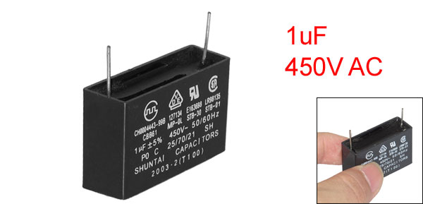 Product Name Motor Capacitor Housing Material Plastic Dielectric Material Polypropylene Film Model CBB61 Capacitance 1uF Tolerance ±5% Rated Voltage 450V AC Frequency 50/60Hz Lead Spacing(Approx.) 3.1cm/1.2'' Lead Length 1.2cm/0.47'' Overall Size 3.6 x 1.3 x 3.3cm/1.4'' x 0.5'' x 1.3'' (L*W*H) Color Black Weight 14g Package Content 1 x Motor Capacitor - Reviews