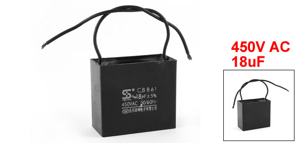 Terminal Wire Rated Capacitance 18uF Tolerance ± 5% Rated Frequency 50/60Hz Rated Voltage 450V AC Body Size 6 x 5.3 x 2.8cm / 2.4" x 2.1" x 1.1" (L*W*H) Wire Length 13cm / 5.1" Main Color Black Weight 112g Package Content 1 x Motor Run Capacitor - Reviews
