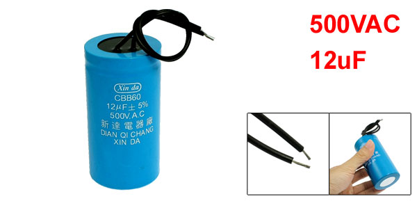 Product Name Motor Capacitor Model CBB60 Dielectric Material Polypropylene Film Rated Capacitance 12uF Capacitance Tolerance ±5%, Rated Voltage 500VAC Size 8 x 4 cm/3.1" x 1.6"(L*Dia.) Cable Length 24cm/9.4" Material (External) Plastic Main Color Blue, Black Weight 148g Package Content 1 x Motor Capacitor - Reviews