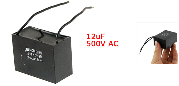 Product Name Motor Capacitor Model CBB61 Material(External) Plastic Rated Capacitance 12uF Tolerance 5%SH Rated Frequency 50Hz Rated Voltage 500V AC Size 5.8 x 4.2 x 2.8cm/2.3" x 1.7"x 1.1"(L*W*T) Cable Length 10cm/3.9" Weight 72g Package Content 1 x Motor Running Capacitor - Reviews