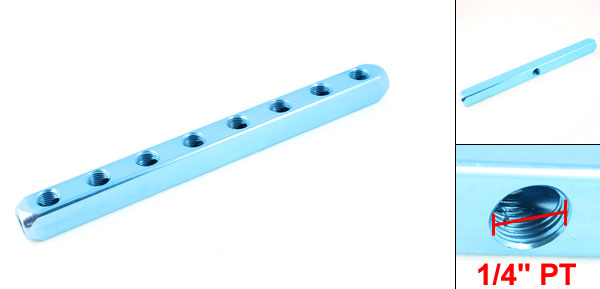 DetailsBlue 1/4" PT Air Pneumatic Cylinder 8 Ways Aluminum Manifold Block Splitter  Product Name Manifold Block Threaded Ports Quantity 11 Ports Way 8 Color Blue Material Aluminum Threaded Port Size 1/4" PT Overall Size 23.5 x 2 x 2cm / 9.3" x 0.8" x 0.8" (L*W*H) Weight 166g Package 1 x Manifold Block