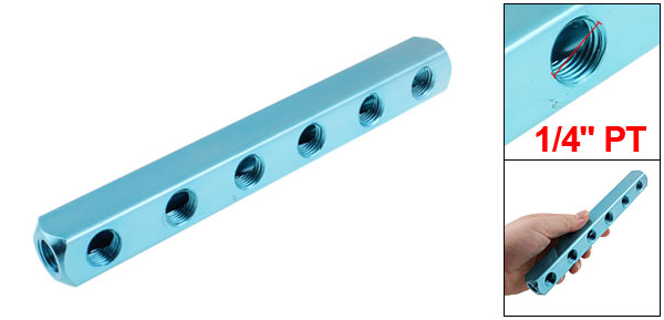 Product Name Manifold Block Threaded Ports Quantity 9 Position Quantity 6 Color Blue Material Aluminum Thread Type 1/4" PT Female Thread Dia. 13mm Overall Size 185 x 20 x 20mm / 7.3" x 0.8" x 0.8" (L*W*H) Weight 130g Package 1 x Manifold Block - Reviews