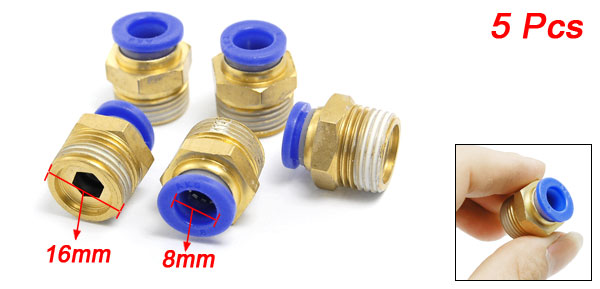 DetailsBlue Gold Tone Pneumatic Air Tubing Push in 8mm Connect Fittings 5 Pcs  Item Name Quick Fittings Total Size 20 x 17mm /0.8" x 0.67"(L*D) Thread Diameter 16mm/0.629" Inner Diameter (Blue End) 8mm/0.314" Material Chrome Plated Brass & Plastic Color Gold Tone, Blue Weight 74g Package Content 5 x Quick Fittings