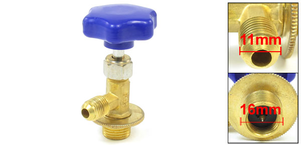 Product Name Can Tap Valve Color Blue, Gold Tone Material Metal, Plastic Hole Inner Dia 5mm/ 0.2" Side Thread Diameter 10mm/ 0.4" Bottom Thread Diameter Outer: 16mm/ 0.63"