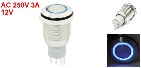 DetailsBlue LED Light 12V Latching 5 Pin Stainless Steel Button Switch AC 250V 3A  Brand Assisi Terminal Number 5 Country of Manufacture CHINA Lamp Type LED Material Stainless Steel Contact Type Com+NO+NC Total Size 38 x 19mm/1.5" x 0.75"(L*Max.W) Product Name Push Button Switch Net Weight 14g Package Content 1 x Push Button Switch Pole and Throw SPDT Light Voltage DC12V SizeName-ColorName Blue 16mm LED Lamp Color Blue Switch Housing Material Stainless Steel Switch Rating AC 250V, 3A Oeperation Type Latching(Self Locking)