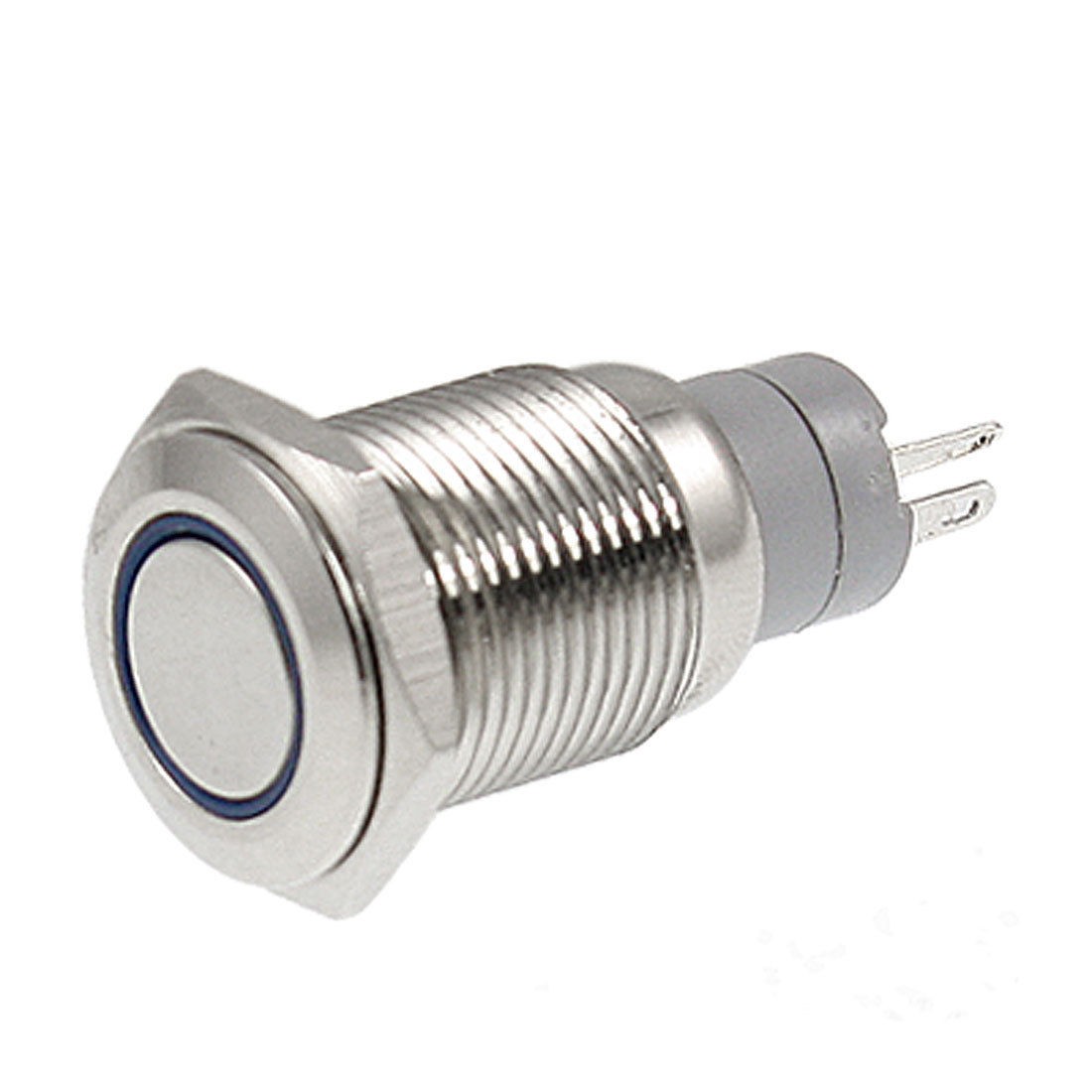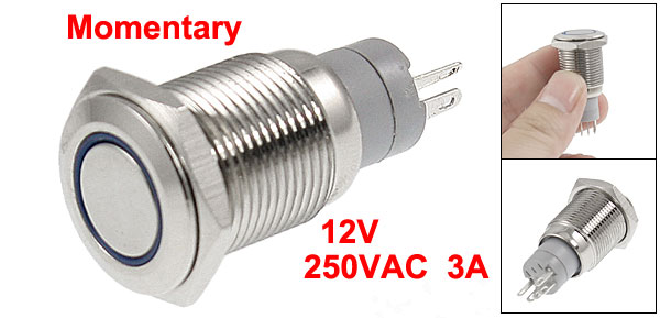 Item Name Stainless Push Button Switch Operation Type Momentary LED Type Ring-illuminated LED Head Shape Flat Head Contact 1NO 1NC; Switch Rating 250VAC, 3A Light Voltage 12V LED Color Blue Pin Number 5 Thread Diameter 16mm/0.63'' Total Size 38 x 19mm/1.5'' x 0.75''(L*Max.W) Material Stainless , Electric Parts Housing Color Silver Tone Net Weight 15g Package Content 1 x Stainless Push Button Switch - Reviews