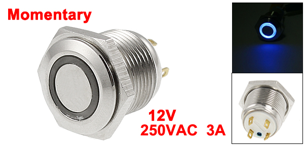 Item Name Metal Push Button Switch Operation Type Momentary LED Type Ring-illuminated LED Contact 1NO Switch Rating 250VAC, 3A Light Voltahe 12V LED Color Blue Pin Number 4 Thread Diameter 16mm/0.63'' Total Size 22 x 19mm/0.86'' x 0.75''(L*Max.W) Material Metal, Electric Parts Housing Color Silver Tone Net Weight 13g Package Content 1 x Metal Push Button Switch - Reviews
