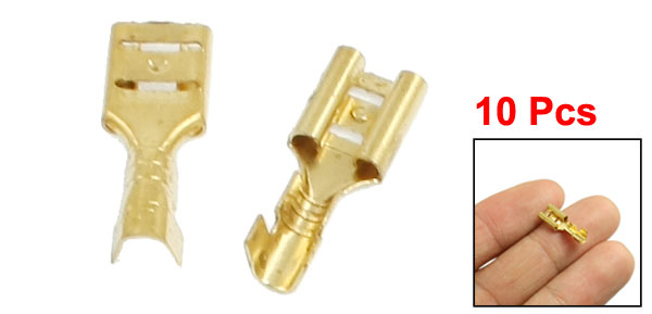 Product Name Female Spade Terminal Connector Material Brass Fit Stud Width 4.8mm/0.2" Total Size 15 x 6 x 2mm/0.6" x 0.2" x 0.1" (L*W*H) Fit Cable Diameter 2.5mm/0.1" Main Color Gold Tone Weight 3g Package Content 10 x Female Spade Terminal Connector - Reviews