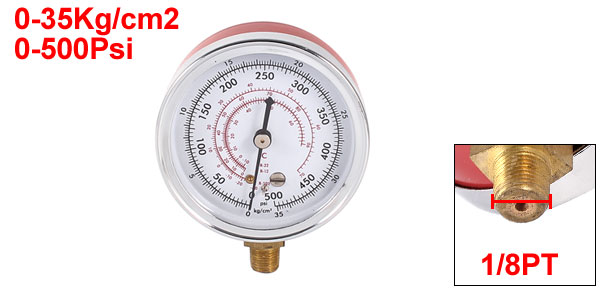 Product Name Pressure Gauge Range 0-35Kg/cm2, 0-500Psi Total Size 86 x 70 x 29mm/ 3.4" x 2.7" x 1.1" ((L*D*T) Dial Dia 70mm/2.8" Thread Diameter 10.2mm/1/8PT External Material Metal, Plalstic Color Silver Tone, Red, Brass Tone Net Weight 141g Package Content 1 x Pressure Gauge - Reviews