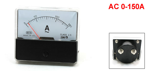Product Name Analog Ammeter Model BP-670 Measuring Current Range AC 0-150A Accuracy Class 2.5 Meter Face Size(Approx.) 7.2 x 6.1 x 1.3cm / 2.8" x 2.4" x 0.51" (L*W*H) Total Depth 4.5cm / 1.8" Mounting Thread Dia. 5mm/ 0.12", 3mm/ 0.12" Material Plastic, Electronic Components Color White, Black Weight 89g Package Content 1 x Analog Ammeter