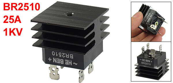 Product Name Single Phase Bridge Rectifier w Heatsink Model No. BR2510 Output Current 25A Repetitive Peak Reverse Voltage 1KV Pitch Distance 18mm/0.7"