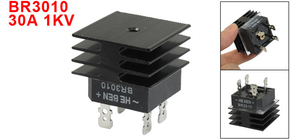 DetailsBR3010 30A 1KV Single Phase Bridge Rectifier Half-Wave Black w Heatsink  Product Name Single Phase Bridge Rectifier w Heatsink Model No. BR3010 Output Current 30A Repetitive Peak Reverse Voltage 1KV Pitch Distance 18mm/0.7" 13mm/0.5" 7mm/0.3" Rectifier Body Size(No Include Pin) 32 x 32 x 11mm/1.3" x 1.3" x 0.4"(L*W*H) Heatsink Size 34 x 34 x 16mm / 1.3" x 1.3" x 0.6"(L*W*H) Total Length 40mm/1.6" Screw Hole Diameter 3.4mm/0.1" Material Metal, Plastic Color Black Net Weight 42g Package Content 1 x Single Phase Bridge Rectifier w Heatsink