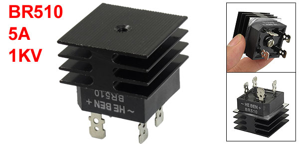 Product Name Single Phase Bridge Rectifier w Heatsink Model No. BR510 Output Current 5A Repetitive Peak Reverse Voltage 1KV Pitch Distance 18mm/0.7"