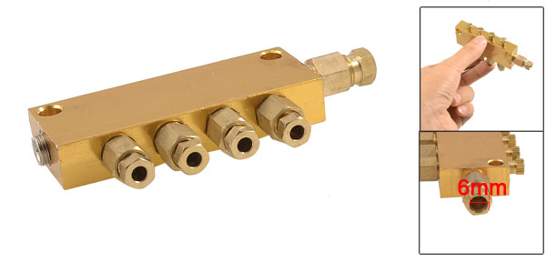 Product Name Adjustable Distributor Type 4 Way Material Brass Color Gold Tone Fit for Tube Inner Dia. 4mm/ 0.16"; 6mm/ 0.24" Mounted Hole Dia. 6mm/ 0.23" Hole Distance 67mm/ 2.64" (Center to Center) Dimension 100 x 53 x 13mm/ 3.9" x 2.1" x 0.51"(L*W*H) Net Weight 126g Package Content 1 x Pneumatic Adjustable Distributor - Reviews