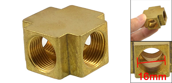 Product Name Female Cross Connector Design Square Design, 4 Ways Thread Size PT 3/8" Thread Dia. 16mm Overall Size 34 x 34 x 20mm / 1.4" x 1.4" x 0.78" (L*W*T) Material Brass Color Gold Tone Net Weight 72g Package Content 1 x Female Cross Connector - Reviews