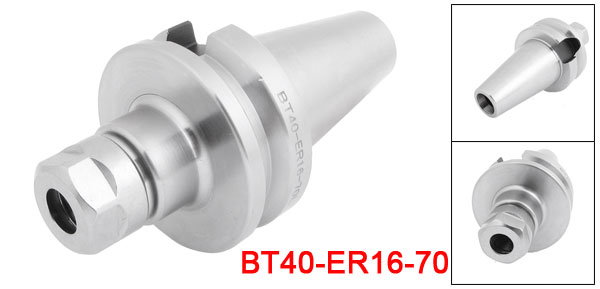 DetailsBT40-ER16-70 Collet Chuck Milling Lathe Tool Holder Silver Tone  Product Name Collet Chuck Tool Holder Model BT40-ER16-70 Material Carbide Steel Color Silver Tone Spindle BT40 Nut Type ER Drawbar Thread M16 Accuracy 0.01mm Balance 10000RPM Collet Clamping Range 1-10mm/1/16"-3/8" Nut Outside Diameter 28mm/1.1" To The Spindle End Shank Length 70mm/2.8" Overall Size 130 x 63 mm/ 5.1" x 2.5" (L*Max Dia) Net Weight 1079g Package Content 1 x Collet Chuck Tool Holder