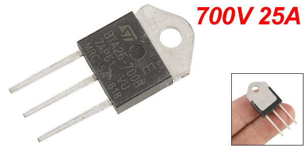 Product Name Triacs Model BTA26-700B Voltage 700V RMS on-state Current 25A Mounting Hole Diameter 4mm/ 0.16" Pin Size 16 x 5.04mm/ 0.63" x 0.2" ( L* Pitch) Body Dimension 36 x 15 x 4mm/ 1.4" x 0.6" x 0.16" (L*W*T) Weight 6g Package Content 1 x Triacs - Reviews
