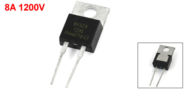 Product Name Diodes Model No. BY329-1200 Mounted Type Through Hole Average Forward Current 8A Peak Repetitive Reverse Voltage 1200V Mounting Hole Diameter 3.8mm / 0.15" Pin Size 13 x 5mm / 0.5" x 0.20" ( L* Pitch) Total Size 28 x 9 x 4mm / 1.1" x 0.35" x 0.16" (L*W*H) Main Material Silicon Main Color Black, Silver Tone Weight 3g Package 1 x Diode - Reviews