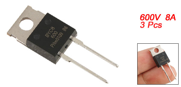 Product Name Rectifier Diode Model No. BYC8-600 Drain Source Voltage 600V Drain Current 8A Mounting Hole Diameter 3.7mm/ 0.147" Pin Size 13 x 5mm/ 0.51" x 0.2" ( L* Pitch) Total Size 29 x 10 x 4.5mm/ 1.14" x 0.39" x 0.18" (L*W*H) Weight 7.5g Package 3 Pcs x Rectifier Diode - Reviews