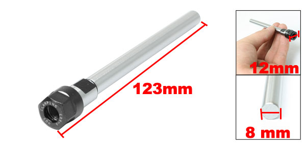 Product Name Straight Collet Chuck Model C08-ER8-100L Shank Diameter 8 mm / 0.3" Clamping Diameter 6.5 mm / 0.25" Hex Width 12 mm / 0.47" Overall Size 123 x 13 mm / 4.8" x 0.5" (L*Max.D) Material Carbon Steel Color Silver Tone, Black Net Weight 48g Package Content 1 x Straight Collet Chuck - Reviews
