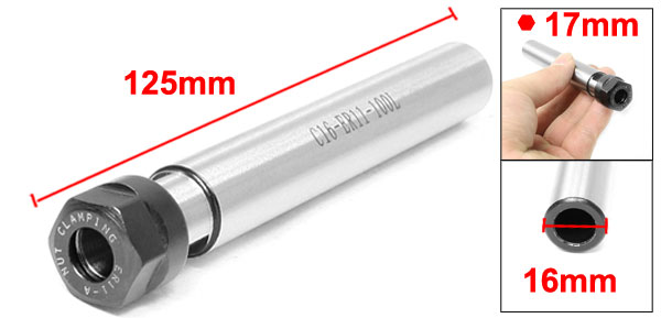 Product Name Straight Collet Chuck Model C16-ER11-100L Shank Diameter 16 mm / 0.63" Clamping Diameter 8.5 mm / 0.33" Hex Width 17 mm / 0.67" Overall Size 125 x 20 mm / 4.9" x 0.8" (L*Max.D) Material Carbon Steel Color Silver Tone, Black Net Weight 129g Package Content 1 x Straight Collet Chuck - Reviews