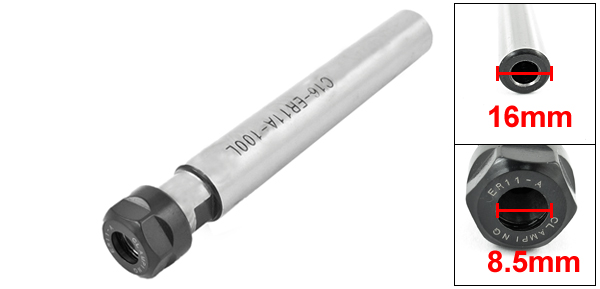 Product Name Straight Collet Chuck Model C16-ER11-100L Shank Diameter 16 mm / 0.63" Clamping Diameter 8.5 mm / 0.33" Hex Width 17 mm / 0.67" Overall Size 124 x 20 mm / 4.9" x 0.8" (L*Max.D) Material Carbon Steel Color Silver Tone, Black Net Weight 157g Package Content 1 x Straight Collet Chuck - Reviews