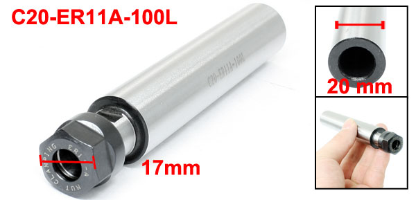 Product Name Straight Collet Chuck Model C20-ER11A-100L Shank Diameter 20 mm / 0.79" Clamping Diameter 8.5 mm / 0.33" Hex Width 17 mm / 0.67" Overall Size 125 x 20 mm / 4.9" x 0.8" (L*Max.D) Material Carbon Steel Color Silver Tone, Black Net Weight 207g Package Content 1 x Straight Collet Chuck - Reviews