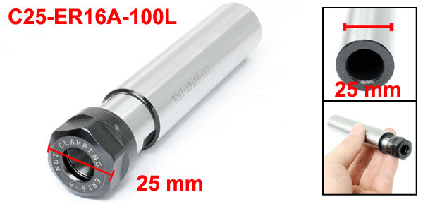 Product Name Straight Collet Chuck Model C25-ER16A-100L Shank Diameter 25 mm / 1" Clamping Diameter 13 mm / 0.5" Hex Width 25 mm / 1" Overall Size 135 x 25 mm / 5.3" x 1" (L*Max.D) Material Carbon Steel Color Silver Tone, Black Net Weight 400g Package Content 1 x Straight Collet Chuck - Reviews